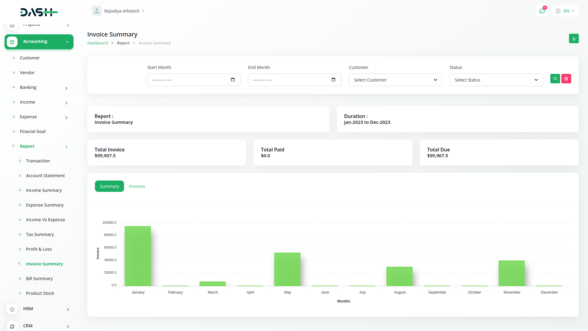 A budget is a financial plan for a specified period to keep in check with the working capital. This feature here helps to maintain the capital flow. You can set monthly, quarterly, half-yearly, or yearly budgets according to your business plans and needs. The main categories are “Income” and “Expense” where one can edit /update /delete the sub-categories as well.